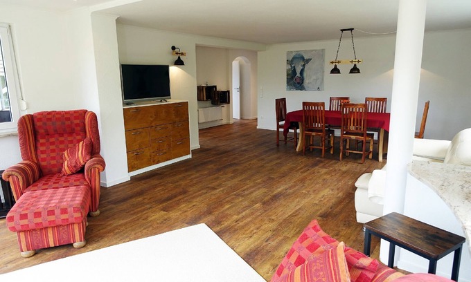 Newly renovated and newly furnished apartment (112sqm) for up to 6 people. Large living room with open transition to the kitchen. 3 bedrooms with king-size bed (180x2000), double bed (160x2000) and comfort bed (140x2000) as well as closets. Bathroom with walk-in shower (hairdryer) and separate toilet. On the terrace there is seating furniture, sun loungers with parasol and a high-quality gas barbecue for cozy hours. Features include: A view of the garden, direct access to the terrace from the kitchen and living room, kitchen with toaster, coffee machine, kettle, dishwasher, oven, fridge, bin bags, tea towels, pots, pans, crockery and breakfast dishes, cutlery and basic spices (salt, pepper, vinegar, oil, coffee and tea), a large flat-screen TV, free WiFi and parking. The wooden character is combined with cozy, modern furnishings and great attention to detail. Bicycles can be stored in the garage. Batteries for your e-bike can also be charged in the garage. There is a washing machine in the house, as well as highchairs, cribs and a changing mat. Fresh eggs from our happy hens on request. To relieve our room fairies, we ask our guests to strip all beds and collect the towels and kitchen towels in the bathroom. The accommodation also offers a SUP for free use.