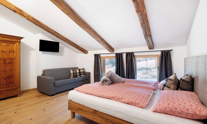 The holiday apartment Herzleierhof Friedrich von Rodank with step-free interior in Rodeneck is the ideal accommodation for a relaxing holiday with a view of the Alps. The 55 m² property consists of a living room with a sofa bed for 2 people, a kitchen, 2 bedrooms and 1 bathroom and can therefore accommodate 6 people. Additional amenities include high-speed Wi-Fi (suitable for video calls) as well as a TV. Breakfast basket on request for a fee.