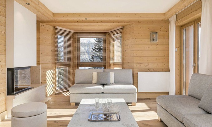 This stylish and modern apartment features a luminous and spacious living area that captures breathtaking vistas of the surrounding peaks. The living room has plush seating, beckoning you to unwind in front of the wood fireplace on cosy evenings. At the same time, the adjacent dining area offers the ideal setting for intimate family dinners with a view.