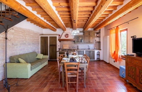 Nestled atop a peaceful hill, this charming countryside retreat offers panoramic views and a deep sense of calm. The Tulipano apartment is part of a beautifully restored farmhouse, combining rustic charm with modern comfort. Guests can unwind by the shared swimming pool just steps away, or enjoy quiet mornings on the private porch with garden views. The home is ideal for couples or small families looking to slow down and reconnect with nature—pets are welcome, and the open grounds are perfect for outdoor play or leisurely walks. The surrounding region is a treasure trove of history and culture. Just a short drive away, you'll find the medieval town of Cagli with its ancient architecture and hidden piazzas. Explore nearby gems like Fossombrone and Urbania, or head to the stunning UNESCO city of Urbino, birthplace of Raphael. The Adriatic charm of Fano also makes for a delightful seaside day trip. Outdoor lovers can hike Monte Nerone, explore river trails, or simply enjoy the rolling hills dotted with vineyards and olive groves. Dining here is an experience in itself. Indulge in truffle-based dishes from Acqualagna or visit one of the many family-run trattorias nearby for authentic Marche cuisine. A short walk away, the on-site restaurant and bar by the second pool serves local specialties and aperitifs at sunset. Enjoy wine tastings at nearby cellars or pick up fresh regional produce to cook your own Italian feast. Whether you're relaxing poolside or exploring the region, this is your home for a truly local escape.