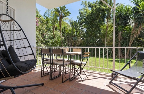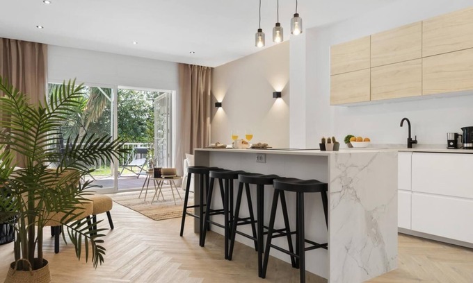 Discover this bright holiday rental flat in Marbella, ideal for families and groups of friends for up to 6 people. With 128 m2 on the ground floor and two cozy terraces, this completely refurbished flat, located in the emblematic urbanization Andalucía del Mar, on the beachfront of Puerto Banús, offers all the comforts for a perfect holiday.