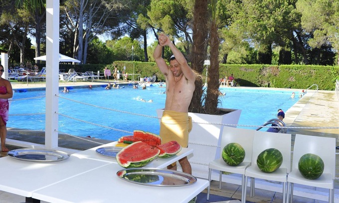 The spacious holiday complex is located on 1.8 hectares of land with gardens, pine forests and Mediterranean maquis. All apartments have a covered terrace and offer every comfort. The complex offers a wide range of sports such as tennis, squash, basketball, football, hiking, table tennis and bicycle rental. You can enjoy a varied holiday in the 350 m2 outdoor pool. For your children there is a children's pool and a children's playground. A restaurant and the entertainment program in the summer months round off the offer. Your family will definitely feel at home here. Hints: -Private beach service from 01/06 to 15/09 -- for a fee (entrance to the beach (free), beach service (for a fee): 1 parasol + 2 loungers, EUR 120,-, please reserve & pay on site -the pool is open from May 15th to September 15th. -Animation from June 1st to September 15th -Wi-fi only in public areas (free) -Meals on request and to be paid on site -Mobility: not suitable for people with limited mobility