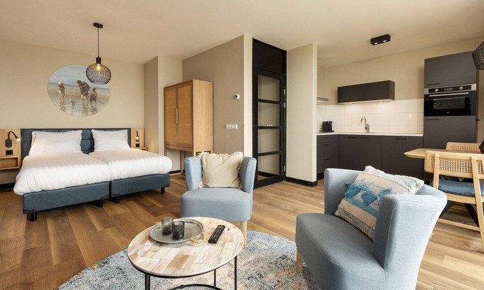 Experience a completely reimagined stay at De Graaf van Egmont, beautifully renovated and reopened in 2021. This stylish ground-floor apartment for two offers modern comfort with a spacious living room, smart TV, and a sleek open kitchen equipped with a fridge-freezer, dishwasher, and microwave. The bedroom features plush box-spring beds configured as a double, while the walk-in shower and contemporary bathroom add a spa-like feel to your stay. Whether it’s a romantic weekend or a solo retreat, this serene space is the perfect coastal base. Located right on Egmond aan Zee’s boulevard and just behind the dunes, you're literally moments from the beach. Stroll the shoreline, explore the nature-rich dunes, or take in a sunset from your private balcony with garden furniture. The residence includes a lift for easy access to all floors and a dedicated parking space, making it as convenient as it is beautiful. Please note: pets are not allowed, ensuring a quiet, allergy-friendly environment. Craving fresh seafood or a beachside brunch? Walk to nearby favorites like Zilte Zoen, Van Speijk, or De Zilvermeeuw—all offering ocean views and locally inspired menus. From warm beach cafés to charming bistros in the village center, your taste buds are in for a treat. This inviting apartment offers a peaceful and stylish retreat, just steps from Egmond’s best experiences.