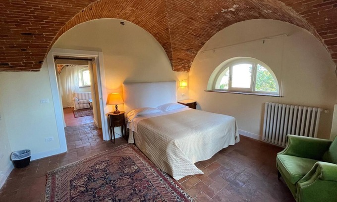 Apartment inside Villa Sermolli with an area of about 100 square meters, with equipped kitchen, two double bedrooms, large living area, 1 private bathroom with bathtub, courtesy set, minibar, wifi, flat screen TV, hairdryer, air conditioning, original terracotta floor and vaulted brick ceiling. View of the surrounding countryside and garden. BREAKFAST IS NOT INCLUDED. It is possible to buy the breakfast voucher on site at a cost of 15 euros per person per day.