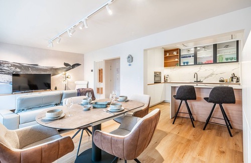 300m from the sea - 2 bedrooms - 4 people Completely renovated and modern apartment on the ground floor, 300m from the sea, in the center of Koksijde, close to the sea, shops and restaurants. Pets allowed on request. Layout The apartment consists of an entrance hall, a bathroom with walk-in shower and a double bath, a laundry room with washing machine, dryer and drying rack, a separate toilet, two bedrooms, one with a double bed and the other with two single beds. Each bedroom has a washbasin and a large mirror. The living room consists of a television, a floor lamp, two coffee tables, an electric two-seater sofa, a relax armchair with footrest and two individual armchairs. The dining room and kitchen consist of a floor lamp, a table (expandable) with 4 chairs, two bar stools, an induction hob, an extractor hood with remote control, a combination microwave, a dishwasher. For more privacy, the apartment is equipped with electric shutters, curtains and Luxaflex. At the back of the apartment there is an enclosed courtyard with garden furniture (table + chairs and lounge set), a large parasol and illuminated plant beds.