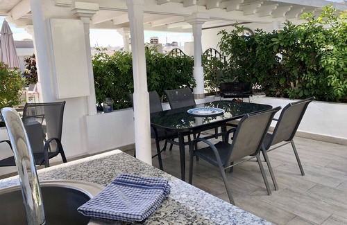 There is also a private roof terrace of 40 sqm with sun beds, a shower, outdoor kitchen with stove and refrigerator as well as a large table with comfortable chairs. Here you can cook a meal and comfortable spend your days outdoors, having a private space to enjoy the sun, make your own drinks and have a shower.