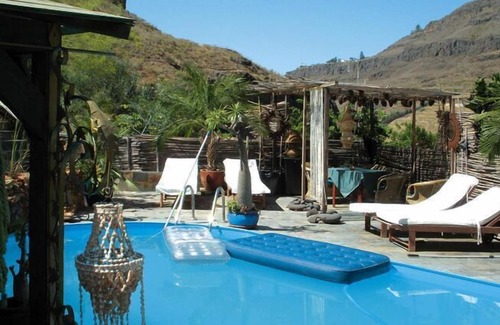 Dive into another world! The very individual wooden houses and bungalows are located in the middle of the mountains in a 40,000 square meter botanical garden with numerous artistic exhibitions. You can admire an abundance of exotic, tropical and indigenous plants and pausing at the sculptures of artists who are prominent in the garden. A tour of the finca becomes a unique experience. The free spirit of the hosts can be felt everywhere: everyone can spend his vacation in his own way, as long as it has no influence on other attendees. Multiple terraces and seats ensure the necessary delay, from which you can enjoy the beautiful view of the wealth of vegetation and the mountain landscape, or the café with a cozy outstand. In the complex restaurant you can enjoy the excellent kitchen between antiques. The property also offers the right setting for seminars, exhibitions and all kinds of parties. Day trips to Maspalomas and Playa del Inglés with their various places of entertainment ensure variety.