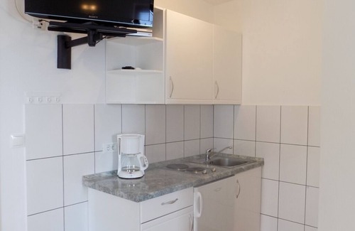 KITCHEN + DINING ROOM + LIVING ROOM: Fridge - less than 100 ltr Kitchen sink - Kitchen sink, Exhaust hood, Electric stove - 2 plate stove, Microwave oven, Drip brewer, Cookware and cooking utensils, Dishes and cutlery, dining table - for 4 persons, TV - SAT-TV - LCD, Air condition, Coffee table, Corner sofa