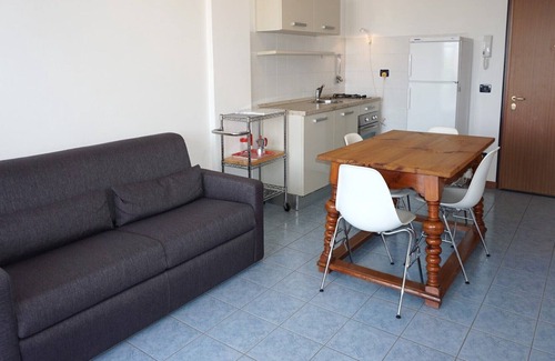 Guests have a swimming pool for adults and a small children's pool, solar terrace, indoor and outdoor parking spaces, elevator. The apartment is modernly equipped, has a full bathroom with shower, TV, coffee maker, air conditioning and a garden on the ground floor. The apartment is composed by a living room with kitchnette and it includes a sofa bed for two guests and a double bedroom.