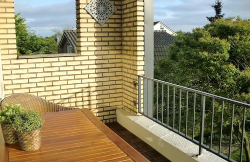 Layout: On the 1st floor: (open kitchen(dining table, electric kettle, toaster, cooker(4 ring stoves, gas), hood, coffee machine(filter, pads), combination microwave, fridge-freezer), Living/diningroom(TV, seating area, wireless music system, streamingservice), bedroom(double bed(two single duvets, 160 x 200 cm)), bathroom(shower, washbasin, toilet, washing machine), balcony)