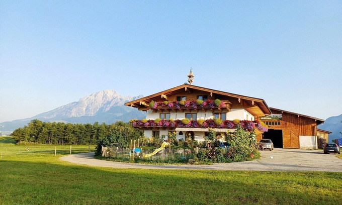 In this cozy holiday apartment in Saalfelden, families and friends can spend a wonderful holiday on the farm. The apartment is part of an organic hay milk farm, which is surrounded by lush meadows and is beautifully situated at the foot of the Steinernes Meer. In addition to winter and mountain sports in the skiing and hiking area of Saalbach Hinterglemm-Leongang-Fieberbrunn, young and old can experience where the milk from the supermarket really comes from and test how delicious raw milk or freshly collected eggs from happy chickens taste! Every single cow still has its own name here. There are many farm animals waiting for you and farm products that can be purchased. The apartment is equipped with everything you need: a fully equipped kitchen including a dishwasher, oven and microwave, TV and single sofa bed in the living room, a cot and garden furniture. You can park on-site. You will receive the Leogang card for your stay.