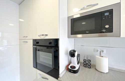 Layout: Elevator, Living room(TV, dining table, seating area), open kitchen(electric kettle, toaster, coffee machine, oven, microwave, dishwasher, fridge-freezer, dishes and cutlery), bedroom(double bed, TV), bathroom(shower), Internet access, Internet access, washing machine, balcony, air conditioning, garden, swimming pool(shared with other guests, including part for children (depth 50cm)), iron, air to air heatpump
