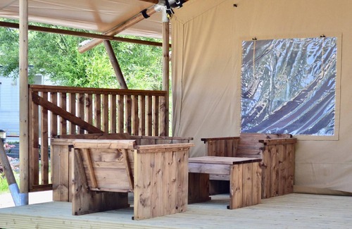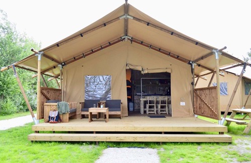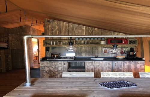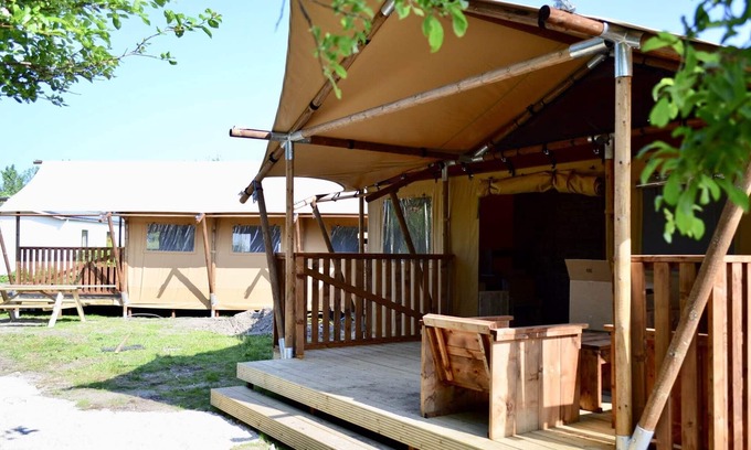 Strandpark Vlugtenburg boasts several beautiful safari tents. These tents are essentially fully equipped accommodations wrapped in the charm of camping. You'll have a fully equipped kitchen with a microwave, gas stove, coffee maker, and refrigerator with freezer. The bathroom features a comfortable shower, sink, and toilet. It's also fully furnished, including comfortable beds. The covered veranda is equipped with garden furniture. For 2026, the tourist tax is 5% of the rental price which is payable on site.