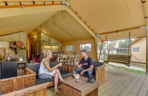 Cozy Forest Retreat with Glamping Comfort Welcome to your stylish tent lodge nestled in the serene landscape of Holiday Park Sandberghe in Uden. This thoughtfully designed space combines the charm of camping with the comfort of home. Inside, you’ll find an open kitchen with a hob, coffee maker, and fridge-freezer—perfect for preparing meals after a day outdoors. The lodge features three cozy sleeping areas, including a loft-style double box bed accessed via steep stairs, and a pellet stove to keep things warm and inviting on cooler nights. Pet-Friendly Paradise & Outdoor Fun The fully furnished terrace and nearby forest trails make this lodge ideal for guests traveling with pets. Bring your furry friend along to explore the nearby Maashorst nature reserve, where leash-free zones and organized pet-friendly walks are popular. With a shared swimming pool on-site and shaded picnic areas just minutes away, the location offers something for everyone—including your four-legged companion. Local Dining & Laid-Back Living Just a short drive from the lodge, Uden’s town center offers a selection of cafés, bakeries, and pet-welcoming restaurants like Brasserie Verhoeven and 't Zusje. After a delicious local meal, return to your peaceful hideaway for a drink under the stars or a cozy evening by the pellet stove. Whether you're here for relaxation or nature-filled adventures, this tent lodge makes the perfect base for your next getaway.