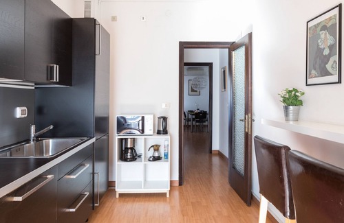 - Large kitchen with induction hob, dishwasher, refrigerator, freezer, breakfast corner with bar stools for breakfast and bright patio door access to the terrace, a / c