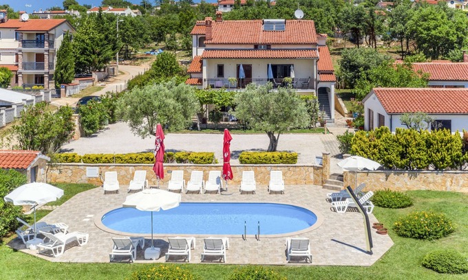 Apartment house "Jukić". 200 m from the centre of Kaštelir, 12 km from the centre of Novigrad, 13 km from the centre of Poreč, in a sunny position, 7 km from the sea. For shared use: property 2'300 m2, garden with plants, swimming pool (9 x 4 m, depth 130 - 150 cm, seasonal availability: 02.May. - 30.Sep. pool opening hours: 09:00-19:00). Outdoor shower, terrace, garden furniture, barbecue house, pool maintenance by the owner/gardener. In the house: internet access. Parking on the premises. Shop, restaurant 200 m, bus stop 12 km, railway station 40 km, pebble beach 7 km. Tennis 200 m. The owner does not accept any youth groups. Please note: the owner lives in the same residence.