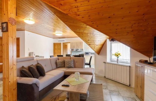 5-room apartment 110 m2, on the upper floor. Spacious, partly with sloping ceilings, renovated in 2021, comfortable furnishings: entrance hall. Living/dining room with cable TV, flat screen and air conditioning. 1 room with 1 french bed (160 cm, length 200 cm). Exit to the balcony. 1 room with 1 french bed (160 cm, length 200 cm), cable TV. 1 room with 1 french bed (160 cm, length 200 cm). 1 room with 1 bed and 1 french bed (160 cm, length 200 cm). Open kitchen (2 hot plates, toaster, microwave). Bath/bidet/WC, shower/WC. No heating option. Balcony. Balcony furniture. Facilities: iron. Parking (2 cars). Please note: non-smokers only. MA20012309