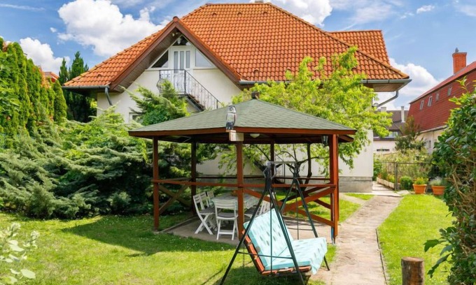 Siófok: Cosy 2-family house "Küsz". In the resort, 1.2 km from the centre, 1.2 km from the lake, 1.4 km from the beach. Private: property 250 m2 (fenced), garden lawn. Pergola (10 m2), fireplace. In the house: WiFi, washing machine. Grocery 100 m, restaurant 60 m, grass beach 1.2 km, thermal baths 2.1 km. Tennis, sports centre 300 m, children's playground 200 m. The owner does not accept any youth groups. Owner lives in separate semi-detached house.