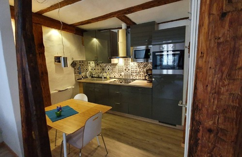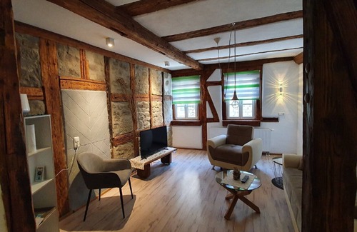 The holiday flat is located in a listed building from the 16th century, which was completely renovated between 2013 and 2019. The ambience combines modern living comfort with a largely preserved historical building fabric. The market square with the town's new town hall is just a 2-minute walk away, and public transport is also within walking distance.