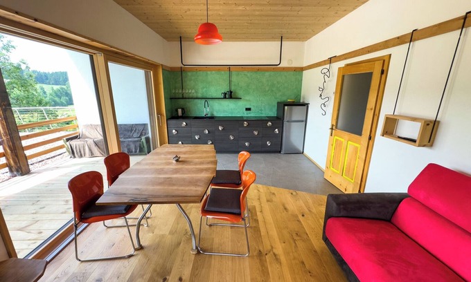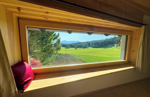 The apartment Kesselmoos Süd-Ost in Nova Ponente offers 50 m² of space for up to 3 guests. You have a living room, a bedroom and a bathroom with barrier-free access. In the private, well-equipped kitchen, you can prepare meals during your stay. The apartment offers mountain views, a covered terrace, Wi-Fi for video calls, TV and a workspace. The accommodation features an idyllic swimming pond, inviting you to refresh and relax on warm days. Washing machine and dryer are available on request and by arrangement. An oven, baby cot, iron and ironing board are available on request and subject to availability.