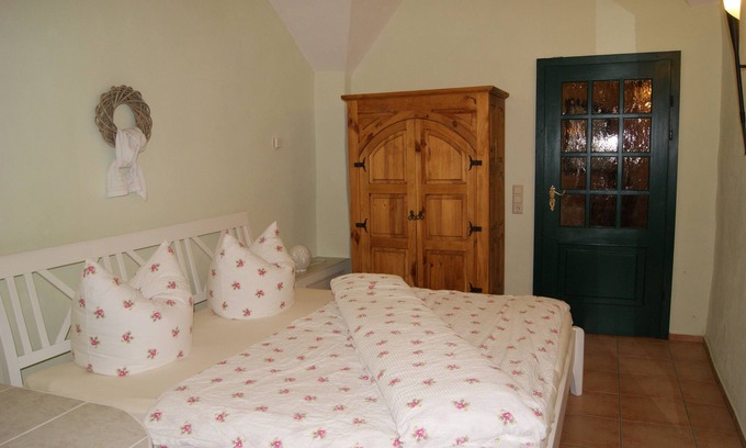 The apartment "Kirchplatz" is located in a town house from the 16th Century, in the picturesque and historic city of Pirnas, next to the city church of St. Marien, near the Tom Pauls Theater. Through the historic seating niche portal dating from 1590, you enter the entrance hall with a cross vault. On the ground floor is the apartment "Kirchplatz" also with cross vault. The entrance hall leads to the romantic courtyard.