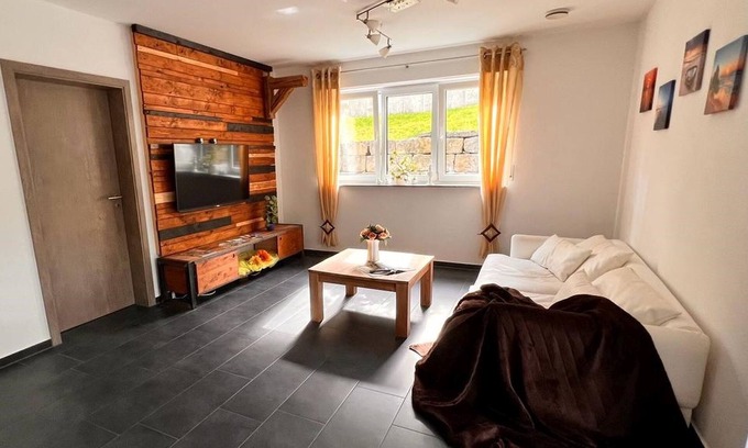 The 60 m² apartment has one bedroom for 2 people. The sofa bed in the living room can accommodate 2 more people. The bathroom has a shower and a separate bathtub. You will find a fully equipped kitchen including microwave and dishwasher. The apartment has a TV, washing machine, furnished terrace incl. barbecue and a parking space at the house.