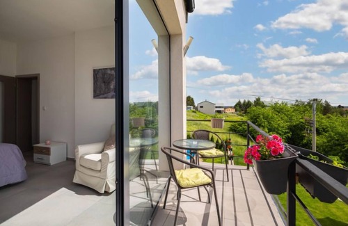 "Lány", 2-room apartment 53 m2 on 1st floor. Modern and cosy furnishings: living room with 1 double sofabed, TV and DVD. 1 room with 1 double bed. Exit to the balcony. Kitchen (dishwasher, 4 ceramic glass hob hotplates, toaster, kettle, microwave, freezer, electric coffee machine). Bath/shower/WC. Floor heating. Balcony. Balcony furniture. Beautiful view of the countryside and the city. Facilities: washing machine. Internet (WiFi, free). Garage. Please note: suitable for families. Non-smokers only. Smoke alarm, fire extinguisher.