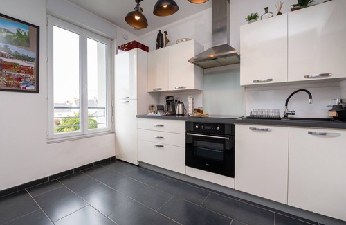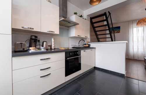 Discover the contemporary charm of this superb duplex located in the peaceful Merville district in Lorient, close to the city center, the Halles, the Base, the sea, and shopping centers. Its modern and refined decor, inspired by the island world of La Désirade, invites you to escape. Completely renovated with style, the apartment combines modernity and comfort. Special attention has been paid to the origin of materials, furniture, bed linen, and utensils. This accommodation is suitable for business trips (workspace with desk, screen, and chair), a weekend exploring the city, or a romantic holiday for two.