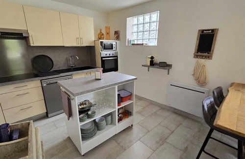 The private entry door is at street level. Once inside, you will discover a beautiful and inviting living space of 40 square meters, a fully equipped open kitchen with island, dining area and a cocooning lounge area. Tastefully decorated the lounge area offers a convertible sofa, television, reading and work areas, and board games, all with a view of the Chapelle Royale (Royal Chapel) park.