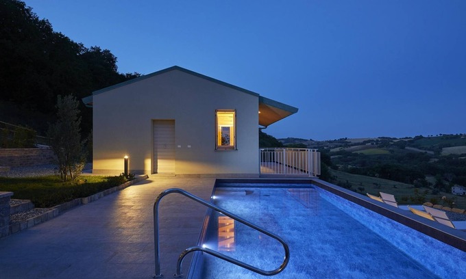 Apartment Loretello is an apartment with pool in Le Marche region located in Arcevia, a town surrounded by nature just a few km from the renowned Frasassi Caves and the Velvet Beach of Senigallia. The accommodation is part of a finely renovated farmhouse consisting of 6 apartments. Inside the balanced mix of modern and classic style with the recovery of antique family furniture and paintings gives charm and a cozy atmosphere. Guests can benefit of a well-kept garden, swimming pool with solarium and gazebo, Jacuzzi and many outdoor areas equipped for al fresco dining and relaxing. Food and wine lovers will also have the opportunity to experience the typical local products, especially the extra virgin olive oil produced on site by the owners. Moreover, it will also be possible for the guests to attend the various olive oil production phases.