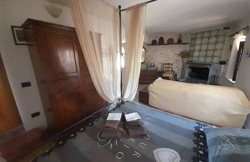 The apartment Mansarda is located in the village of Giomici, 20 mts only from the castle. At the entrance you will find a kitchen corner, on the left side the bathroom and on the right side a spacious living room/bedroom, with fireplace and sofa.