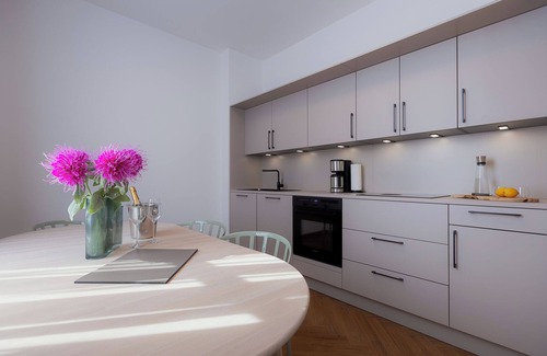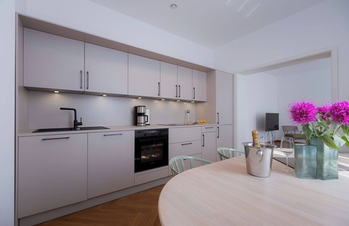 Here you will find large window fronts, state-of-the-art ventilation system, high-quality designer furniture, two bedrooms with box-spring beds, Smart TV in the living room, a large bathroom with walk-in shower, washbasin with mirror and WC, as well as a separate WC.
