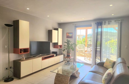 Nestled in a private estate, this 60 m² ground-floor apartment offers all the comfort for a pleasant stay in Provence. It includes a large bedroom with a double bed, a spacious living room, and a fully equipped open kitchen. The modern bathroom features a shower, with separate toilets for added comfort.