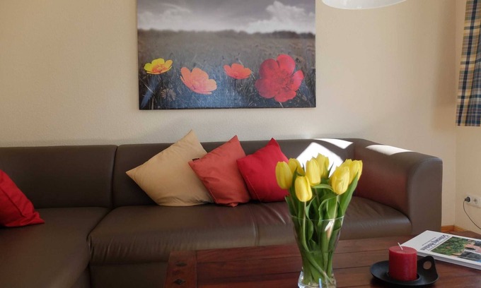 The 4 star apartment Schöne Aussicht offers up to 6 people plenty of space to feel good on two floors. Modern elements are complemented here very successfully with bold color accents. A spacious living area with adjoining terrace, a kitchen with dining area, 3 bedrooms (2x double bed, 2x single bed) and 2 shower rooms with underfloor heating provide pleasant holiday comfort. The beautiful landscape of the area can be enjoyed on the private terrace and seating in the yard and garden. Here garden furniture for relaxing moments and a wide view over the fields and meadows. Of course, Wi-Fi is available free of charge and there are parking spaces in front of the house. Washing machine and dryer can be used for 3, - € per course.