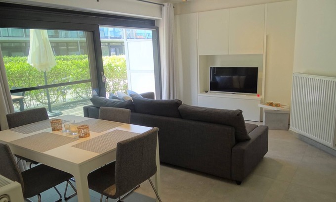 This beautiful ground-floor apartment in Nieuwpoort City offers two cozy bedrooms and a spacious sun-facing terrace, perfect for soaking up the coastal charm. Situated along the scenic canal, it serves as an ideal base for cycling enthusiasts and nature lovers alike. Enjoy the convenience of WiFi and digital TV while unwinding in a tranquil setting just moments from the beach. Whether you're seeking adventure or relaxation, this apartment provides the perfect retreat for an unforgettable stay. Nieuwpoort is a charming coastal town, known for its picturesque beaches, historical landmarks, and vibrant atmosphere. Whether you're looking to soak up the sun, take a refreshing swim in the North Sea, or enjoy a leisurely walk along the coastline, Nieuwpoort Beach provides the perfect backdrop for relaxation and recreation, located within walking distance. You can also Explore the bustling marina, where colorful sailboats and yachts bob gently in the harbor. Enjoy a meal at one of the waterfront restaurants or simply soak in the maritime atmosphere. Explore the scenic countryside surrounding Nieuwpoort on foot or by bike, following a network of well-marked trails that wind through picturesque villages, lush farmland, and peaceful nature reserves. Admire spectacular vistas of the azure sea and golden sands from the comfort of your living space, creating an idyllic backdrop for unforgettable moments. Unwind with your favourite shows on Wi-fi enabled television. Prepare delectable meals with ease in the fully equipped kitchen, complete with modern appliances and ample space for culinary adventures. Indulge in restful nights in the cozy bedrooms, thoughtfully designed to ensure a peaceful sleep experience for all guests. Enjoy hassle-free access to the apartment via the convenient lift.