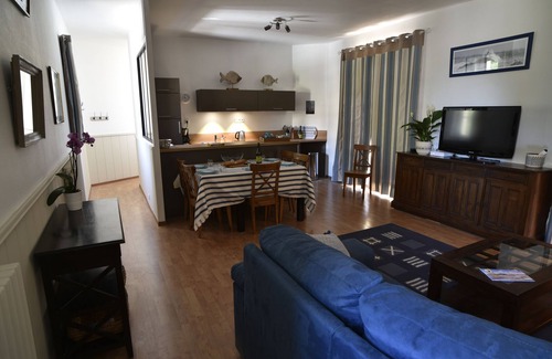 Very well exposed south and south-west, with a living room of 38m ², crossing, lit by 4 windows, the apartment is very bright. It can accommodate 6 people. The living room is equipped with a convertible sofa (Poltrone Sofa); The Vanilla room of a bed in 140 and the Blue room of two twin beds (80x200) assembled. If you come to cure at Thermes, this apartment is ideally placed! The appliances and bathrooms are of high quality. The furniture is in teak and the marine style is asserted. The windows are new and double-glazed. The beds will be made before your arrival, we provide the towels (1 set per person) and we take care of the cleaning at the end of your stay. All this is included in the rental rate.