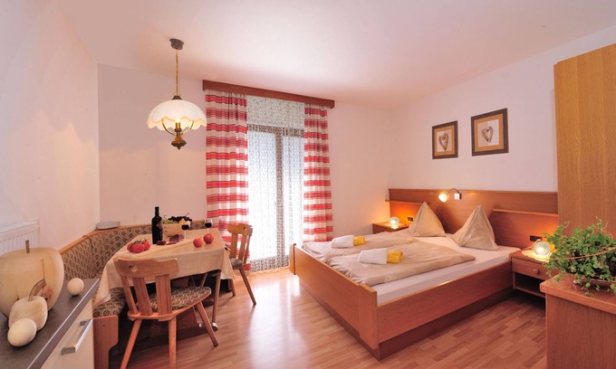 Cozy apartments on the sustainably managed Heiserhof in a quiet location in the Jaufental in the community of Ratschings. Open all year round and ideal for couples. This lovingly furnished monolocal with a fully equipped kitchen, cozy dining area with satellite TV, comfortable double bed, bathroom and access to the balcony provides a very cozy living environment for two (possibly also with a toddler who sleeps in a cot or in the parents' double bed , habitable).