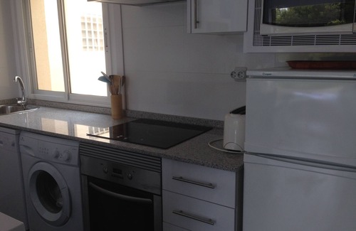 Fitted kitchen with oven, microwave oven, fridge/freezer, coffee maker, toaster and washing machine.