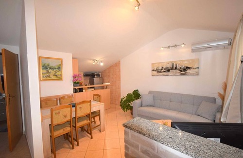 Apartment Paula with a sea view is located in Njivice and is only one hundred meters away from the nearest beach. The apartment is located on the third floor in the attic, it can host 4 people and consists of two bedrooms, a kitchen with a dining room and a living room, a bathroom with a shower, and a balcony with a view of the sea. The apartment is equipped with everything guests need for a pleasant stay, such as air conditioning, internet, parking space, and more. Pets are not allowed in this apartment.