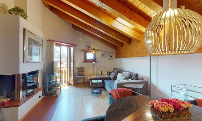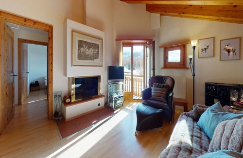 The apartment features a cozy living room with a fireplace and access to a sun-drenched balcony. In the living and dining area, you will find a sofa, armchairs, a TV, and a dining table that can be extended to accommodate 6 people. The kitchen is fully equipped, and the spacious hallway closet offers plenty of storage for fondue, raclette, and board games. A bedroom with a double bed is on the same floor as the living room and kitchen. Two additional bedrooms with double beds are located one floor above. Both rooms have access to a small south-facing balcony. Sun chairs and furniture for the balconies are provided. On this floor, you will find a larger bathroom with a bathtub and heat lamp. The lower floor has a bathroom equipped with a shower. A garage parking space is included with the apartment. Shared laundry room and ski storage available.