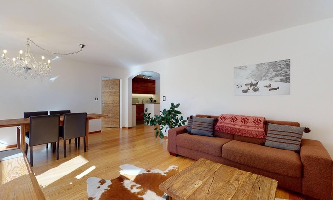 The apartment is located in a quiet area in Samedan. Restaurants, the train station, the Promulins sports center, and the cross-country ski trail are all in close proximity.