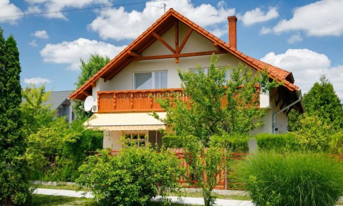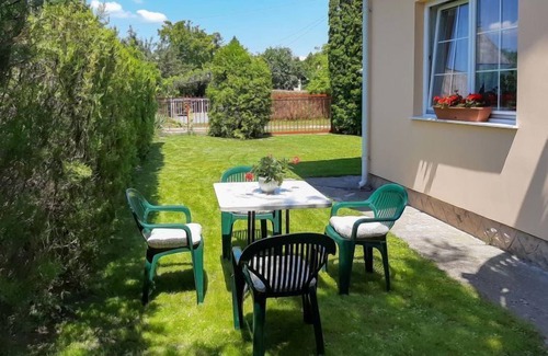 Balatonmáriafürdő 19 km from Keszthely: Cosy 2-family house, 2 storeys. In the resort, 200 m from the lake, 200 m from the beach. Private: garden 100 m2 (fenced) with lawn. In the house: WiFi. Shop 650 m, restaurant 250 m, railway station 1.5 km, grass beach 450 m.