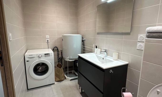 The kitchen is equipped with an oven, a stovetop, and a refrigerator, as well as a coffee maker, a microwave, and cookware. Bathroom amenities include a hair dryer, towels, and toilet paper. And there's a washing machine, so you can even pack a bit lighter. Other amenities include bed sheets, air conditioning, heating, and a dining table.