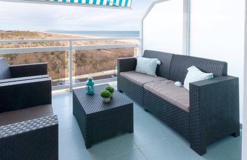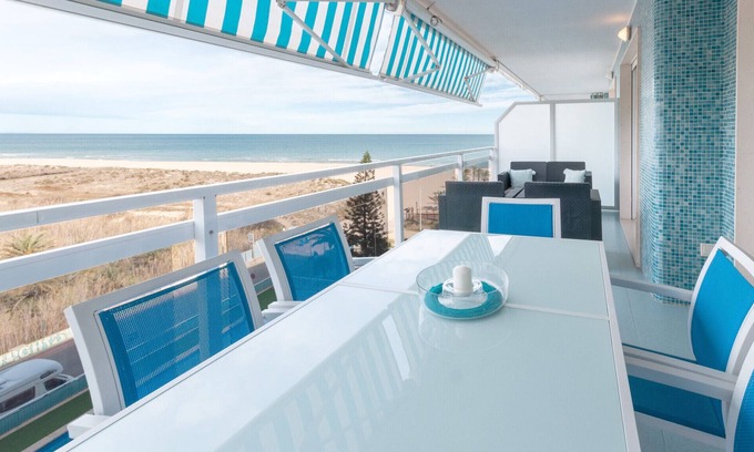 Aiguablava apartment is a luxury beachfront apartment with amazing Gandia Beach views from the large terrace. Its location is an ideal resort for large families looking for a relaxing holiday by the sea. Between the sand and the complex you will find a pedestrian promenade, which joins the promenade, which will allow you to take long walks by the sea. In addition, not having to cross any street makes it ideal for the elderly or families with children.From the terrace you enjoy spectacular panoramic views, which you can enjoy 24 hours a day. Large swimingpool, gym and tennis. The apartment is furnished with a modern and fresh design. Featured with smart TV, and WIFI. Air conditioning / heating in all the bedrooms and livingroom. Pets allowed cost: 40€ total stay.Ask for a Cot (20€) and baby chair (10€)You can play tennis, swimming pool. In the area you can make sea sports, mountain bike, fishing, running, kite surfing, paddle surfing.