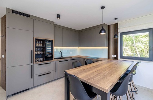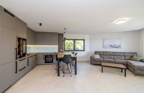 Modern and luxuriously furnished apartment in Polje on the island of Krk has a capacity for 4-6 persons. The apartment is located on the ground floor and has a kitchen, a living room with a sofa bed for two persons, two bedrooms with double beds, one bathroom, and one guest toilet. Guests have at their disposal a private courtyard with a jacuzzi, a barbecue and an outdoor terrace with a beautiful sea view. Guests also have secured parking and an electric vehicle charging station.
