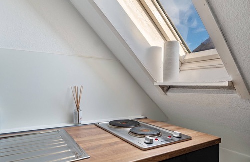 It is a charming and compact apartment in the attic with a sloping roof and a room height of 2 meters.