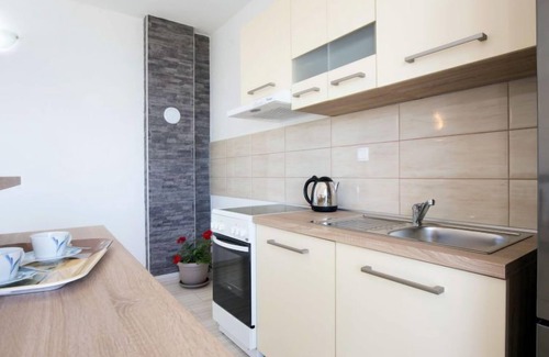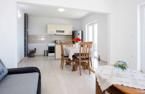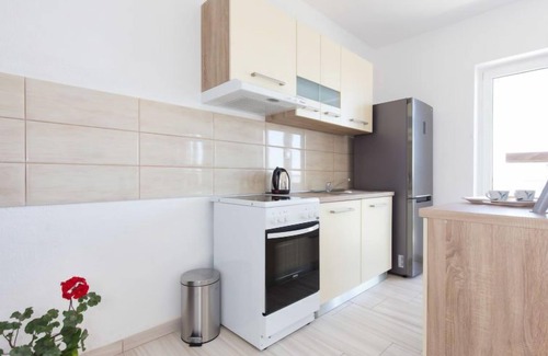 "Suzana", 2-room apartment 55 m2 on 1st floor. Living/dining room with 1 sofabed and satellite TV (flat screen), air conditioning. Exit to the balcony. 1 room with 1 double bed. Open kitchen (oven, 4 ceramic glass hob hotplates, toaster, kettle, freezer, electric coffee machine). Shower/WC. Air-conditioning (extra). No heating option. Balcony. Balcony furniture. Beautiful view of the sea. Facilities: iron. Internet (WiFi, free). Please note: non-smokers only. Max. occupancy: 2 adults, 1 child up to 18 years old.