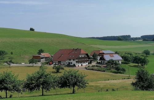 You will stay at a working Black Forest farm with calves, cattle, bulls, cats, and chickens. The farm is located on the south side at the end of a side valley, 4 km from Elzach, surrounded by green meadows where the animals graze. This quiet location offers numerous hiking opportunities and interesting sights in the immediate vicinity, perfect for those seeking peace and relaxation.