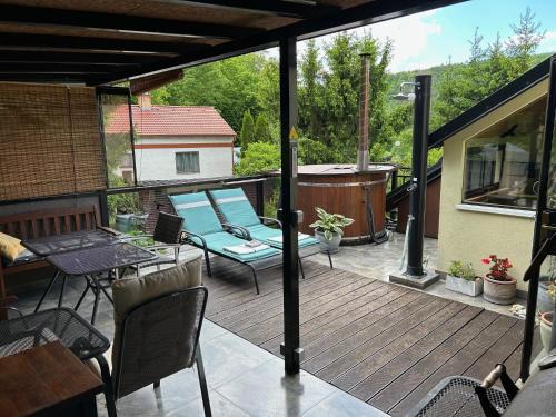 29 miles from Telč Historic Center in Podhradí nad Dyjí, Apartment u Hradu provides accommodations with access to beauty services, fitness room, and open-air bath. 29 miles from Chateau Telč and 8.2 miles from Vranov nad Dyjí Chateau, the property offers a bar and a shared lounge. There's an outdoor fireplace and guests can use free Wifi and free private parking. Providing a terrace and garden views, the apartment includes 3 bedrooms, a living room, flat-screen TV, an equipped kitchen, and 2 bathrooms with a shower. The parquet floors, fireplace, and peaceful vibe add to the ambience of the room. The property has an outdoor dining area. Guests at the apartment can enjoy billiards on-site, or go cycling or hiking in the surrounding area. Bus Station Telč is 29 miles from Apartment u Hradu, while Train Station Telč is 29 miles away. Brno-Turany Airport is 62 miles from the property.