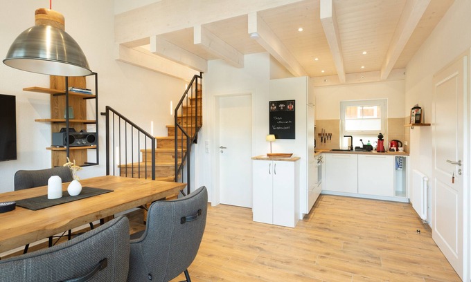 Located in Wehr, this 52 sqm maisonette apartment welcomes up to 4 guests with 1 bedroom featuring a double bed and a living room with a high-quality sofa bed. You will find a private fully equipped kitchen with an open layout connecting to the bright living and dining area. Amenities include Wi-Fi suitable for video calls, TV, highchair, and baby bed for your convenience.